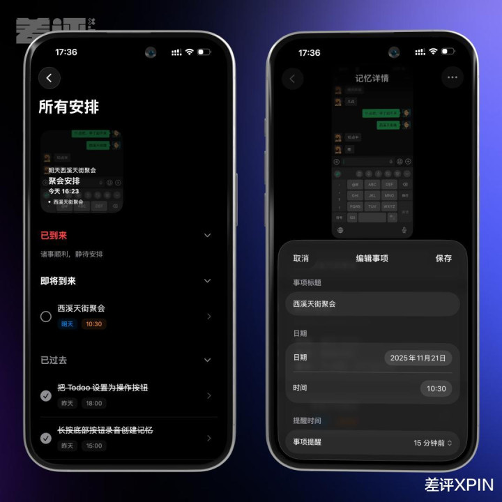 当你按一下按钮,App 会自动帮你在后台截个屏,然后利用 AI 识别图片里的文字,理解你的意图,最后把关键信息提取出来,直接塞进你的日程表里。