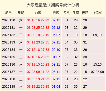 后区分析:近十期后区奖号的大小比为14:6,上一期开出小小数01、04,本期关注后区开出小大数05、12。